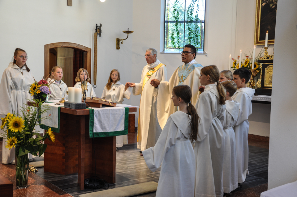 Ein wahres Hochamt war die Festmesse – zelebriert von Pater Markus Solo, der extra aus Rom zu uns angereist ist und exzellent vorbereitet war, und Diakon Hubert Mayr. Pater Markus verstand es sehr gut, während des gesamten Fest-Gottesdienstes immer wieder auf unsere Marienkirche und ihre Entstehung einzugehen.