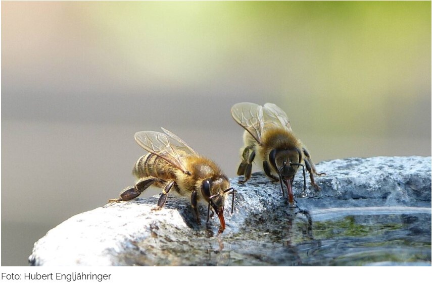 Bienen brauchen nicht nur Nektar und Pollen – auch Wasser ist besonders bei sommerlicher Hitze wichtig. Honigbienen brauchen Wasser zum Kühlen des Bienenstockes, Wildbienen vor allem auch zum Bauen ihrer Nester.