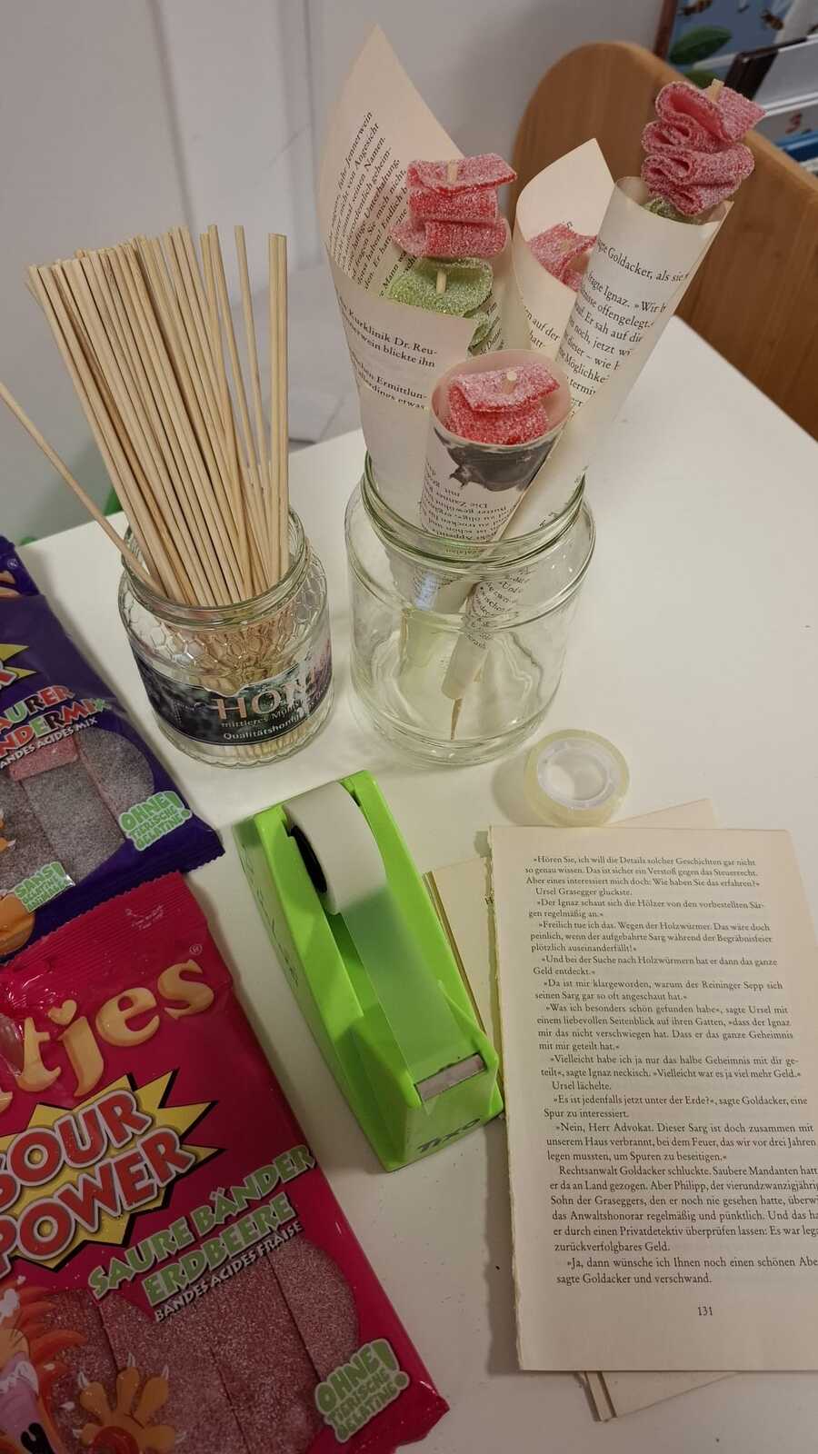 Für unsere jüngsten Besucher:innen haben wir aus alten Büchern kreative Bücherblumen gebastelt, die zusammen mit einer süßen Überraschung für strahlende Gesichter sorgten.