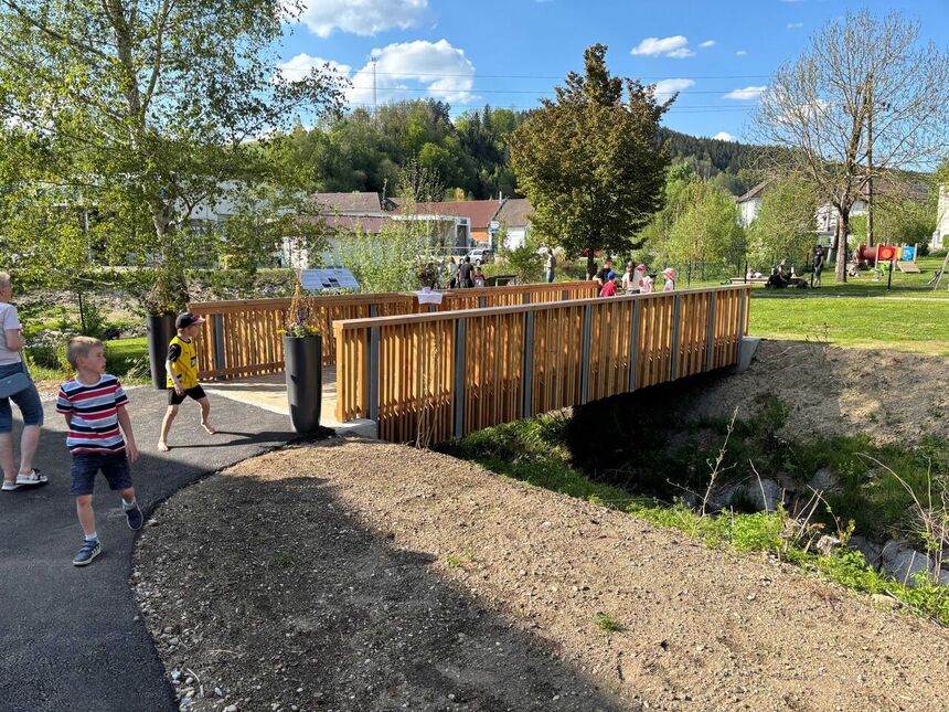 Mit dieser Brücke wurde nicht nur ein bauliches, sondern auch ein symbolisches Zeichen gesetzt: Sie verbindet den Ortsplatz bei der Kirche und dem Jugendheim mit der sogenannten „Genger-Insel“ – einem erweiterten Raum für Spiel, Sport und Veranstaltungen. Ohne eine Straße überqueren zu müssen, gelangen Kinder und Besucher nun sicher zur Insel und zur Sportanlage. Die drei Meter breite Brücke schafft dabei nicht nur Sicherheit, sondern auch Offenheit und Gemeinschaft.