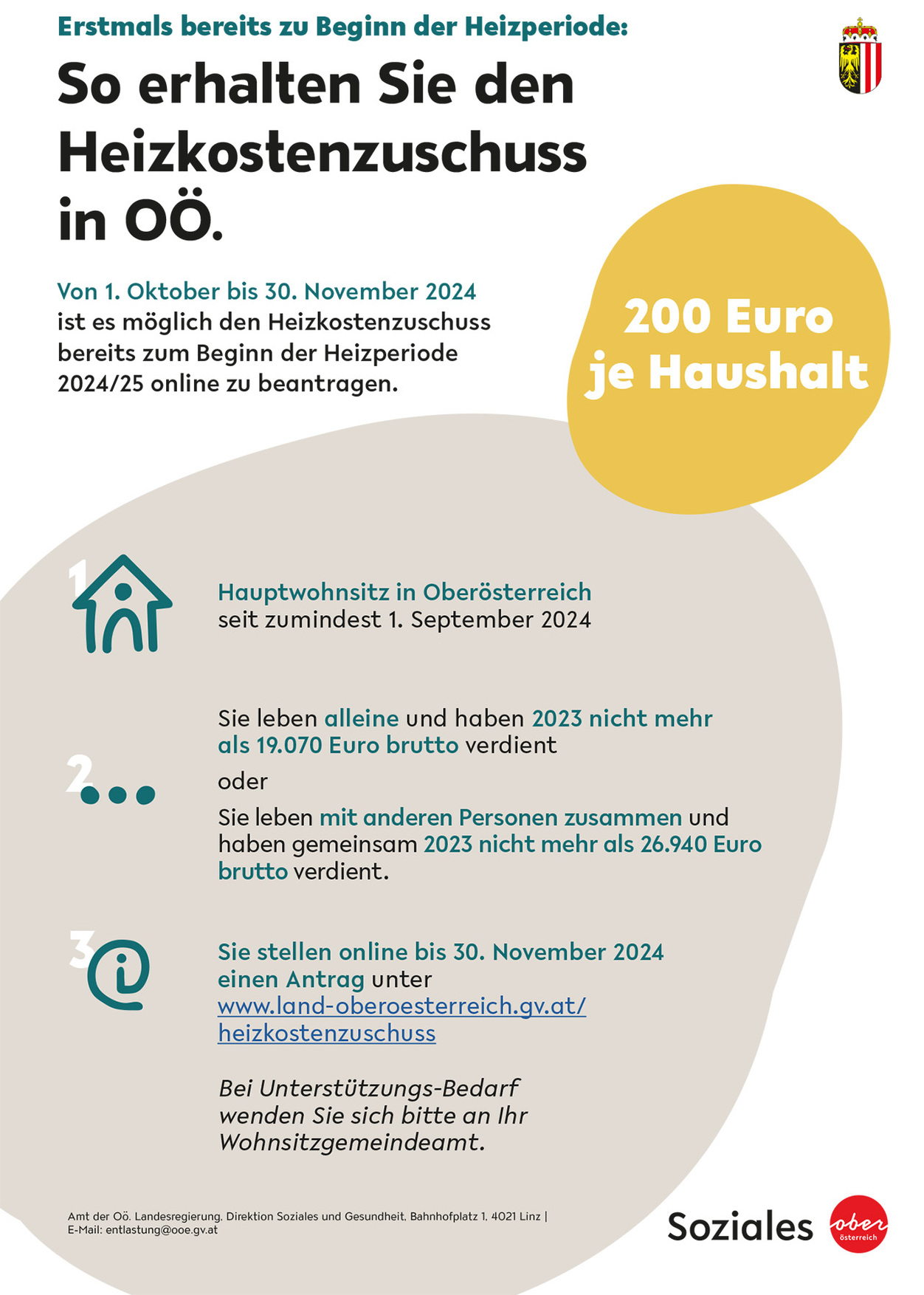 Von 1. Oktober bis 30. November 2024 ist es möglich den Heizkostenzuschuss in OÖ bereits zum Beginn der Heizperiode 2024/25 online zu beantragen.