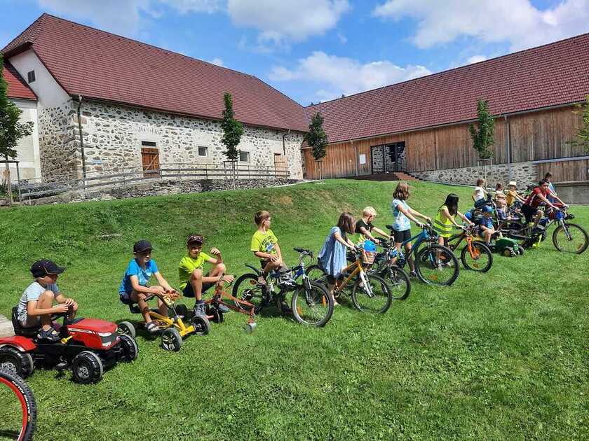 im Moarhof Eidenberg - „Wir sind unterwegs mit Gott“ Viele Kinder und ihre Eltern und Großeltern kamen am 14. Juli bei herrlichem Sommerwetter mit ihren Fahrzeugen in den Innenhof des Moarhofes, um Gott um seinen Segen und eine unfallfreie Zeit zu bitten.