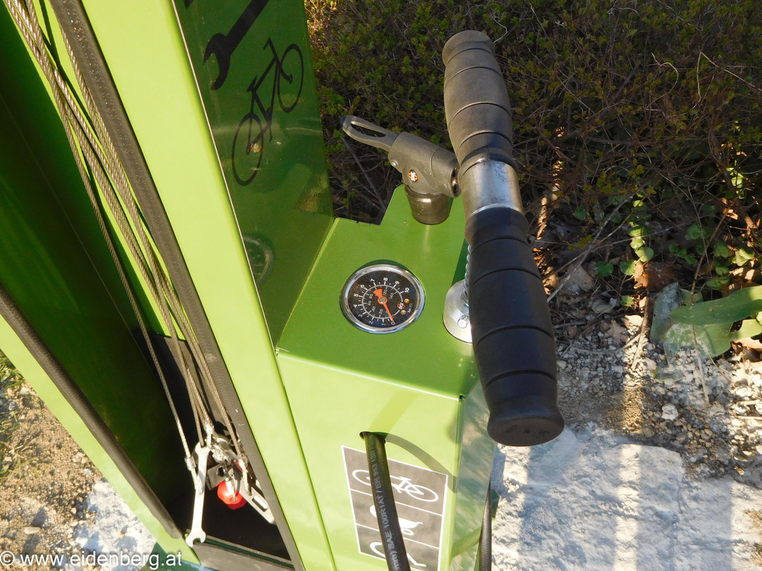 Jede Station ist mit einer Luftpumpe sowie gängigem Werkzeug ausgestattet, sodass beispielsweise ein platter Reifen rasch wieder aufgepumpt oder kleinere Defekte direkt vor Ort behoben werden können.