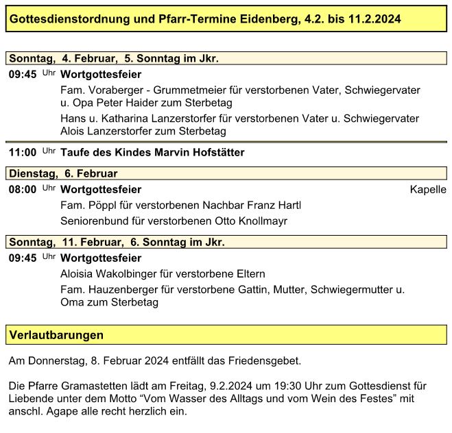 Gottesdienstordnung und Pfarr-Termine Eidenberg für die Woche vom 04. Februar - 11. Februar 2024.