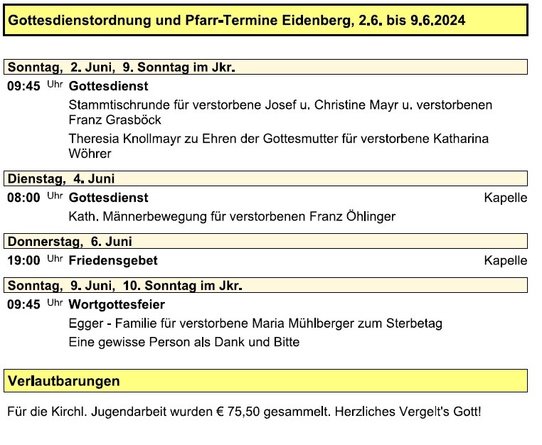 Gottesdienstordnung und Pfarr-Termine Eidenberg für die Woche vom 02. Juni - 09. Juni 2024.