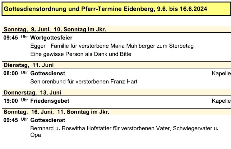 Gottesdienstordnung und Pfarr-Termine Eidenberg für die Woche vom 09. Juni - 16. Juni 2024.