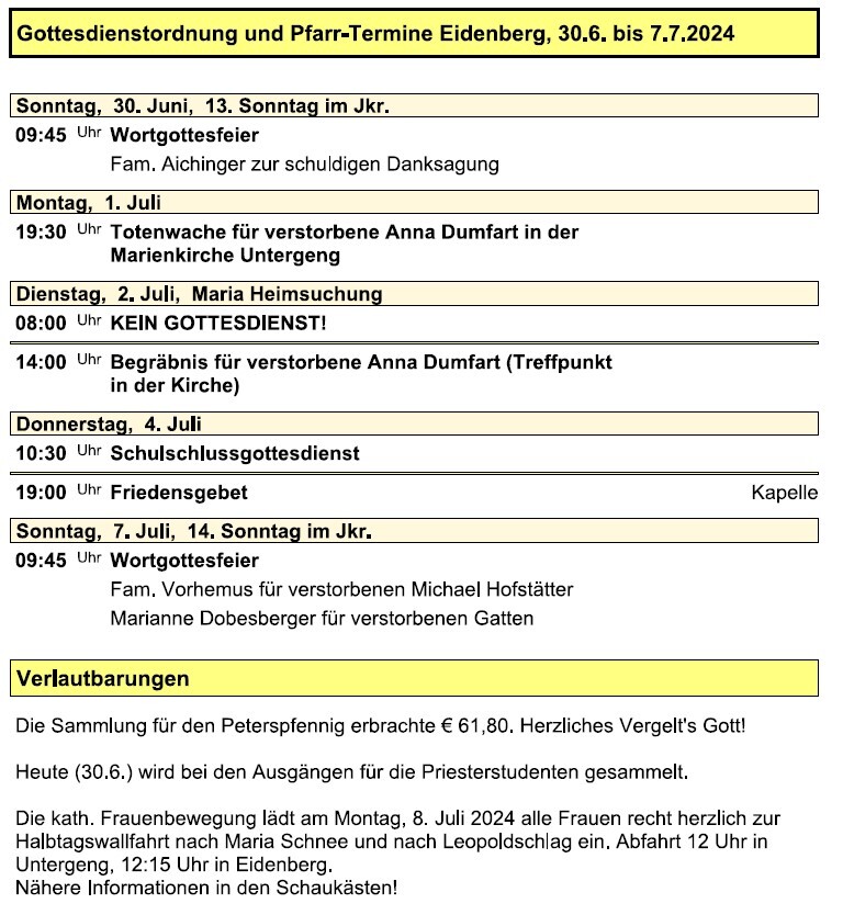 Logo Pfarre EidenbergGottesdienstordnung und Pfarrtermine Eidenberg für die Woche vom 30. Juni - 07. Juli 2024. pdfPfarre Eidenberg - Verkündzettel