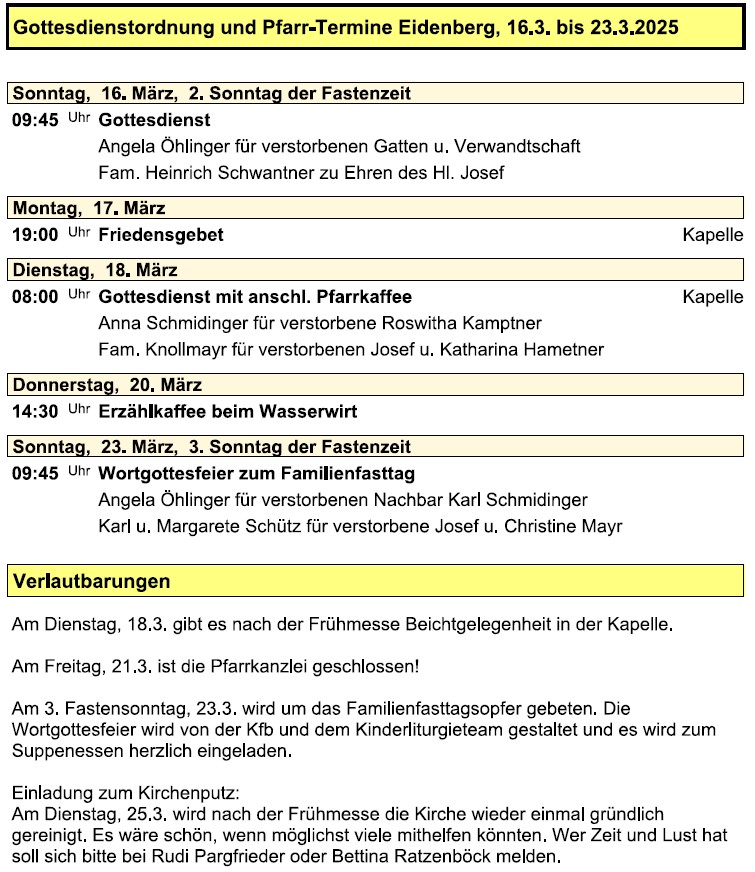 Logo Pfarre EidenbergGottesdienstordnung und Pfarrtermine Eidenberg für die Woche vom 16. März - 23. März 2025. pdfPfarre Eidenberg - Verkündzettel