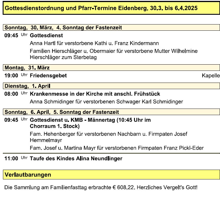 Gottesdienstordnung und Pfarrtermine Eidenberg für die Woche vom 30. März - 06. April 2025.