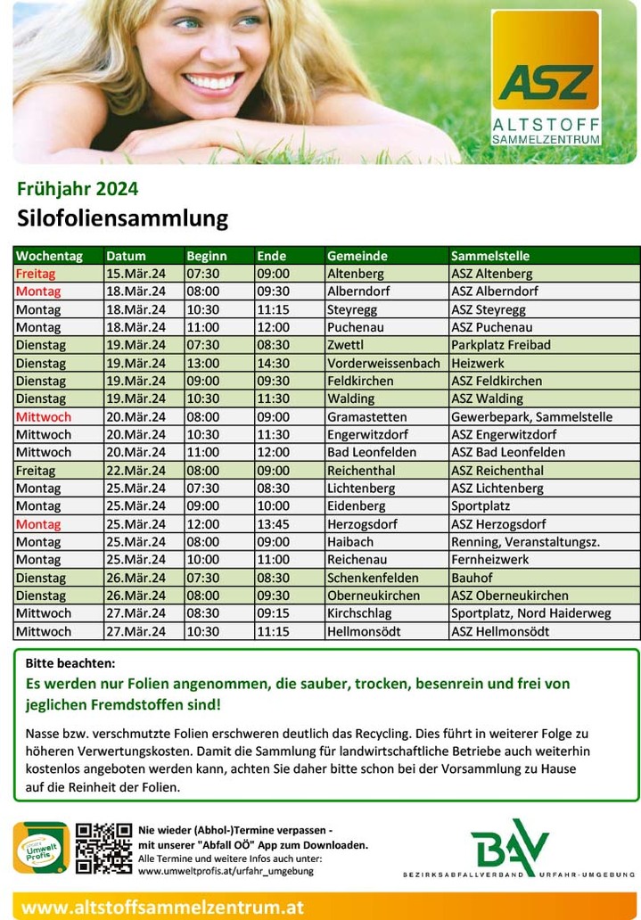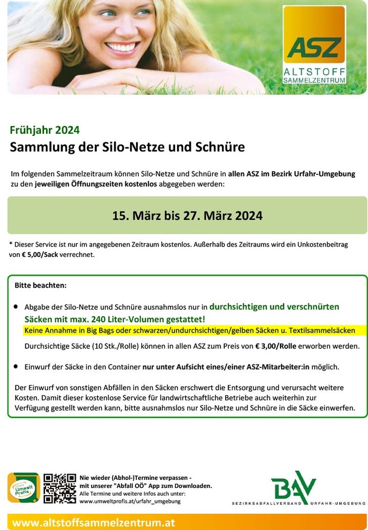 Im folgenden Sammelzeitraum können Silo-Netze und Schnüre in allen ASZ im Bezirk Urfahr-Umgebung zu den jeweiligen Öffnungszeiten kostenlos abgegeben werden.