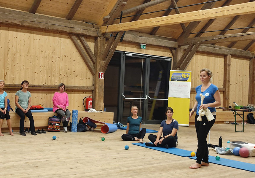 und Hand anlegen die TeilnehmerInnen durch den Workshop. Gemeinsam wurden Füße, Rücken- und Nackenmuskulatur entspannt, das Becken aufgerichtet und Bauch- und Halsmuskulatur gekräftigt. Erklärungen rund um die Wirbelsäule, den Beckenboden und Co. halfen, mehr Verständnis für eine ausgeglichene Haltung zu erlangen. Übungselemente aus dem Bewegungskonzept: Spiraldynamik ® rundeten den Workshop ab. Am Ende blickte man in begeisterte Gesichter, die schon eine Vorfreude auf weitere Abende zu gesunder und achtsamer Bewegung hegen.