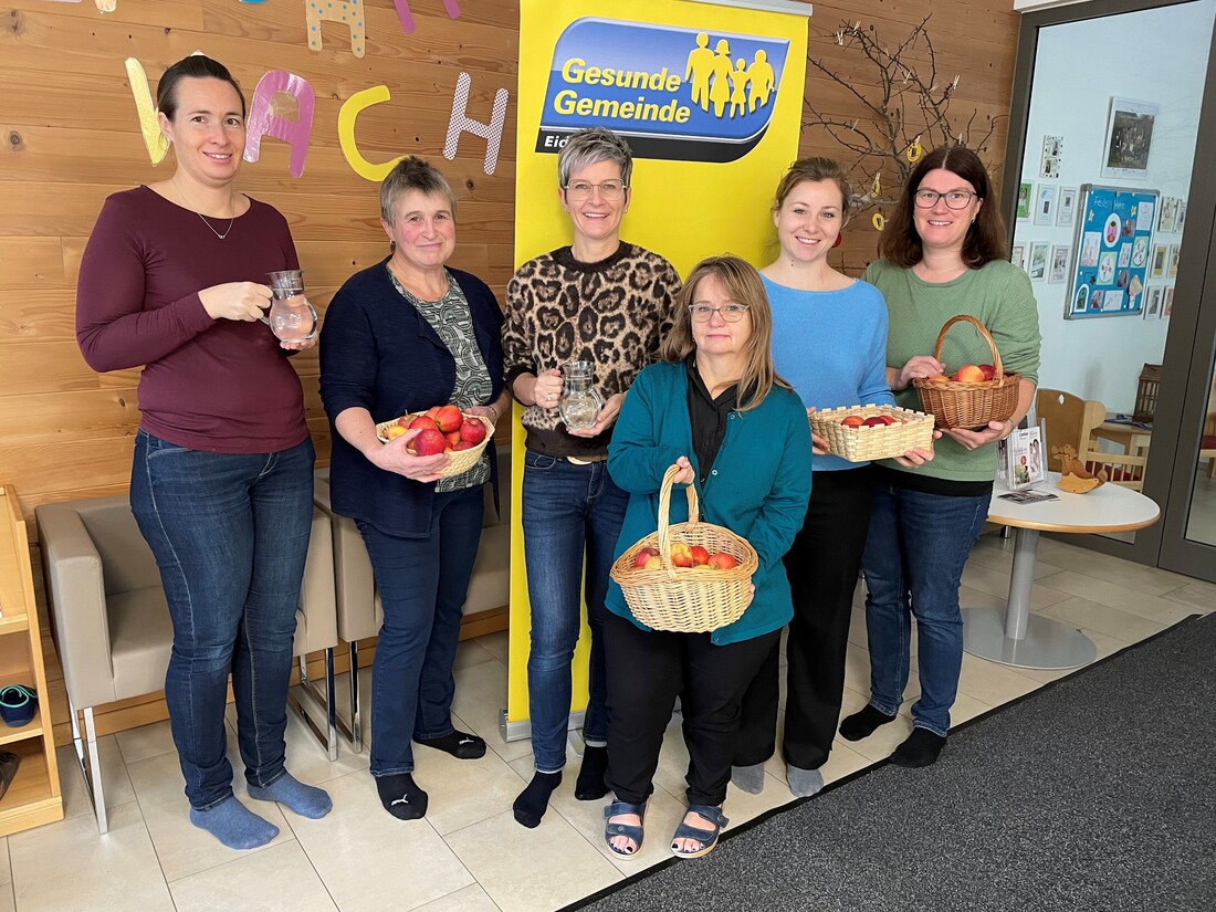 Die Gesunde Gemeinde Eidenberg besuchte auch heuer, anlässlich des Tag des Apfels, den örtlichen Kindergarten und überbrachte heimische Bio-Apfel und Wasserkrüge für die Kleinsten.