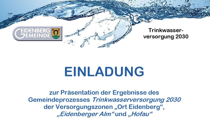 Am 4. November 2024 wurden die Ergebnisse unseres Trinkwasserversorgungsprozesses für die Versorgungszonen „Eidenberg Ort, untere und obere Hofau und Eidenberger Alm“ im Kulturstadl präsentiert. Seit der Startveranstaltung im März 2022 gab es unzählige Besprechungen, Besichtigungen und Abstimmungen mit bestehenden Wasserversorgern. Eidenberg war eine von 4 Pilotgemeinden in OÖ und durfte sowohl mit finanzieller Unterstützung aber auch durch die Mitarbeit der Sachverständigen des Landes diesen Prozess durchführen.