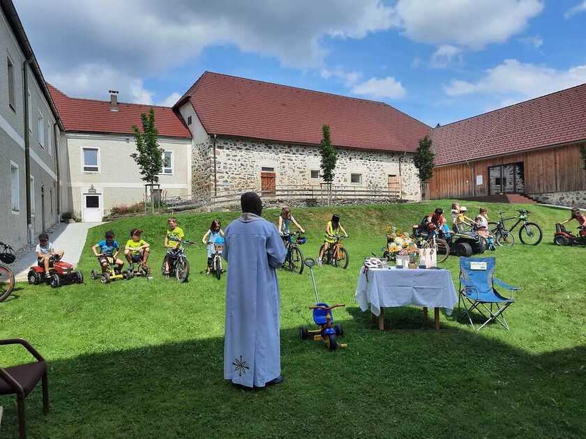 im Moarhof Eidenberg - „Wir sind unterwegs mit Gott“ Viele Kinder und ihre Eltern und Großeltern kamen am 14. Juli bei herrlichem Sommerwetter mit ihren Fahrzeugen in den Innenhof des Moarhofes, um Gott um seinen Segen und eine unfallfreie Zeit zu bitten.