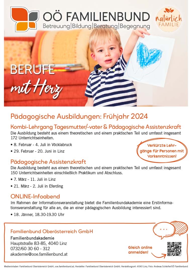 und Pädagogische Assistenzkraft. Die Ausbildung zur Tagesmutter/-vater besteht aus einem theoretischen und einem praktischen Teil. Der Lehrgang vermittelt Wissen über folgende Themenbereiche: Pädagogik, Didaktik, Lernbetreuung, Entwicklungspsychologie, Rechtliches, Gesundheit, Zeit- und Haushaltsmanagement, Kommunikation, Familiensysteme, Umgang mit Missbrauchsfällen u.v.m.