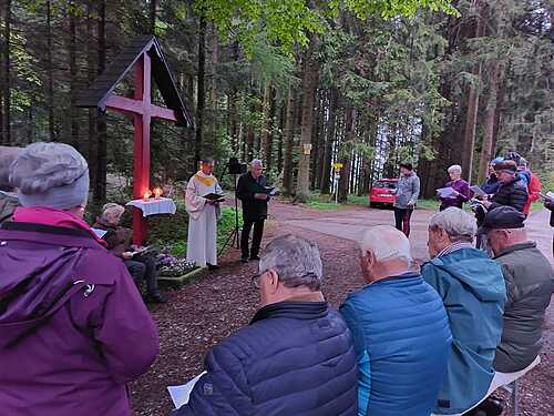 Kameradschaftsbund Eidenberg - Zur traditionellen Maiandacht fanden sich 26 Besucher und Besucherinnen beim Roten Kreuz in Kammerschlag ein. Ferdinand Aichinger hatte eine sehr schöne Maiandacht vorbereitet und stellte diese unter das Thema Frieden. Wunderschön klangen wieder die Marienlieder in freier Natur. Es war kühl, aber nicht kalt und trotz des zuvor regnerischen Tages kam unter den Wolken noch kurz das Abendrot hervor.