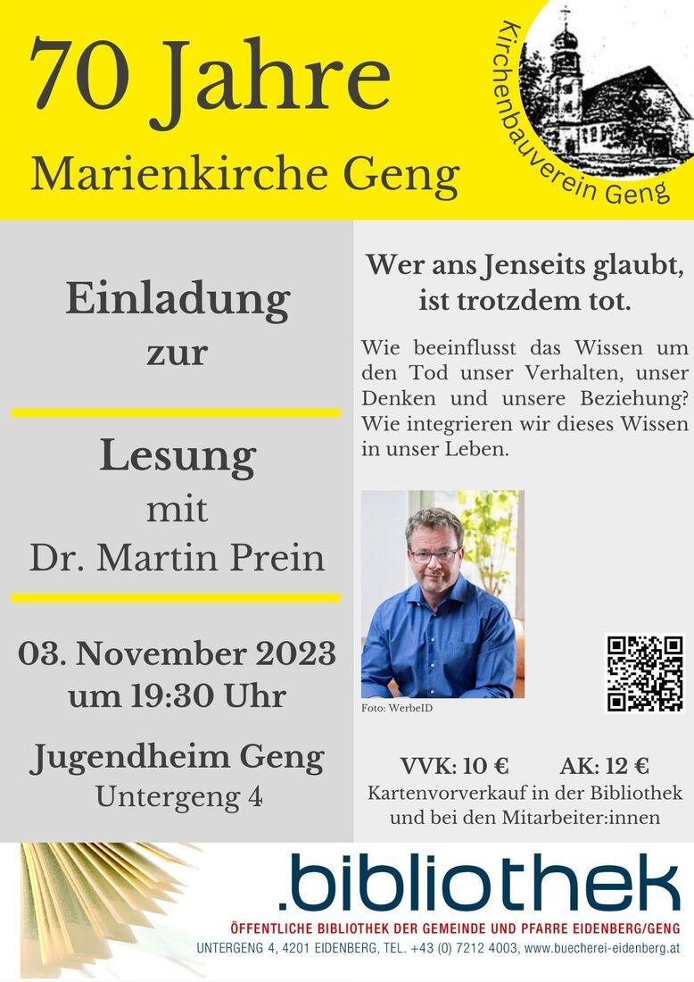 Die Lesung mit Dr. Martin Prein findet am 03. November 2023 um 19:30 Uhr im Jugendheim Geng statt.