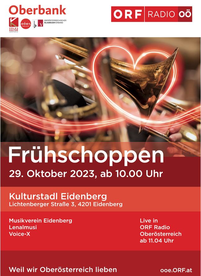 mit dem MV Eidenberg. Der traditionelle Radio Oberösterreich Frühschoppen findet am 29. Oktober 2023 im Kulturstadl Eidenberg statt.