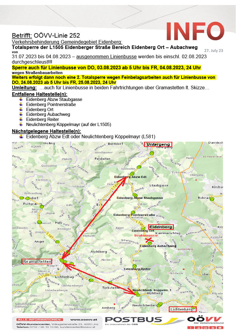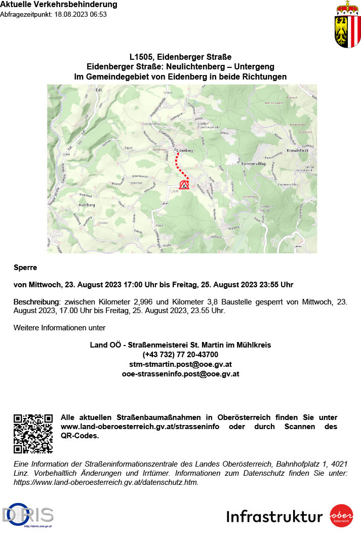 Die L1505 Eidenberger Straße ist von Mittwoch, 23.08.2023 17:00 Uhr bis Freitag, 25.08.2023 23:55 Uhr zwischen Kilometer 2,996 und Kilometer 3,8 in beide Richtungen gesperrt.