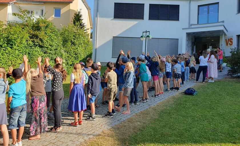 Große Verabschiedung - Bei strahlendem Sonnenschein wurden die Kinder der 4a und 4b nicht nur einfach in wohlverdiente Sommerferien, sondern in einen ganz neuen Abschnitt ihres Lebens, von allen anderen Mitschülern und Mitschülerinnen verabschiedet. Wir wünschen ihnen auf diesem Weg noch einmal alles Gute!