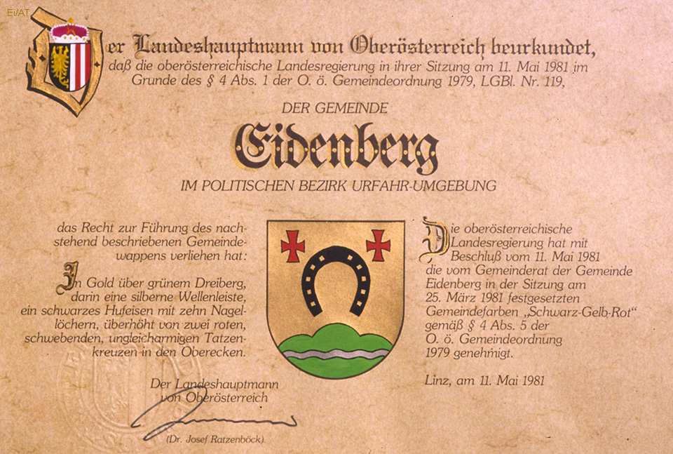 Die drei grünen Hügel, der Dreiberg, stehen als Symbol für die schöne Landschaft, die gepflegten Wiesen und die ausgedehnten Wälder. Das silbernen Wellenband steht für die "Große Rodl", die lieblich die Gemeinde durchzieht. Die zwei roten Kreuze stehen als Symbol für die beiden Gotteshäuser in Eidenberg und Untergeng Das Hufeisen verweist auf das bäuerliche Brauchtum der seit 1956 in Eidenberg durchgeführten Leonhardiritte - der Heilige Leonhard ist Schutzpatron des Eidenberger Gotteshauses. Die zehn Nagellöcher bedeuten die zehn Ortsteile der Gemeinde.