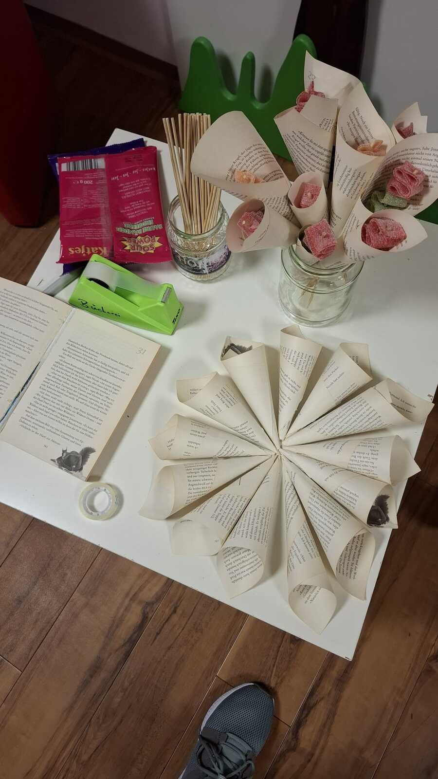 Für unsere jüngsten Besucher:innen haben wir aus alten Büchern kreative Bücherblumen gebastelt, die zusammen mit einer süßen Überraschung für strahlende Gesichter sorgten.