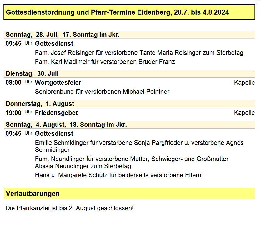 Gottesdienstordnung und Pfarrtermine Eidenberg für die Woche vom 28. Juli - 04. August 2024.